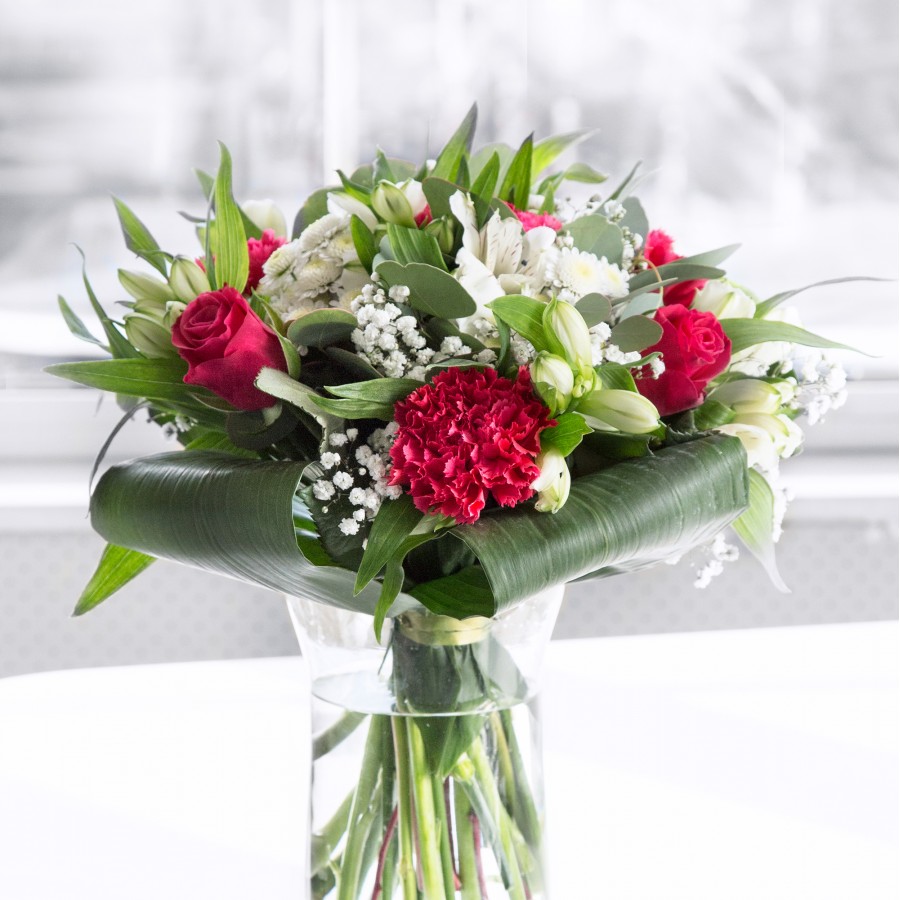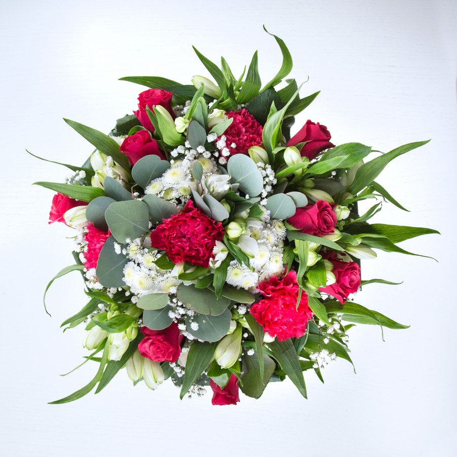 Embrace the luxury of nature with our graceful garden bouquet, designed for those who appreciate timeless elegance and superior quality. The bouquet features sumptuous red roses and pristine white chrysanthemums complemented by delicate gypsophila, carnations, white alstroemeria, and aspidistra leaves. Every bouquet is crafted with love and precision, ensuring a display of natural artistry.